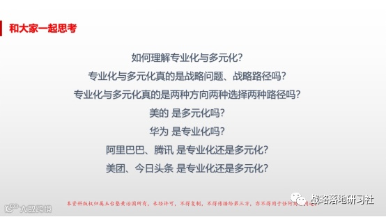 很多企业之所以强调专业化,是因为它多元化的能力不强。你看那些经营能力强的,它都不会说什么多元化专业化,早就干起来了。因为专业化也好、多元化也好,不是一个外向的战略选择问题这么简单,而是企业内生的能力、资源匹配以及抓住市场机会的问题。简单讲,就是你有能力你就可以多干事,你能力不足,你就只干一件事情。所以这是我觉得我们在做战略这个过程当中也要去理清的。