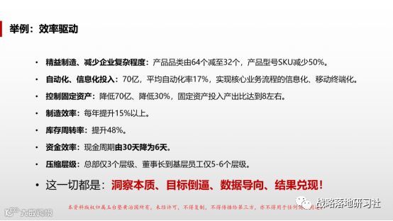 具体来说,美的当时转型确定了三个主轴,其实这些在2010年甚至更早就一直在做,就是“产品领先、效率驱动、全球运营”。这其中的重点就是效率驱动,从上述举例中大家可以看得到,就是整个经营效率在大幅度提高。当然,这个经营效率提高是一个系统工程,比如说减少产品的型号、比如说增加自动化投入、比如说控制固定资产投资、比如说提升固定资产的投入产出比、比如说提高制造效率、比如说缩短现金周期、比如说压缩管理层级等等。通过这一系列的动作,才使美的转型成功。