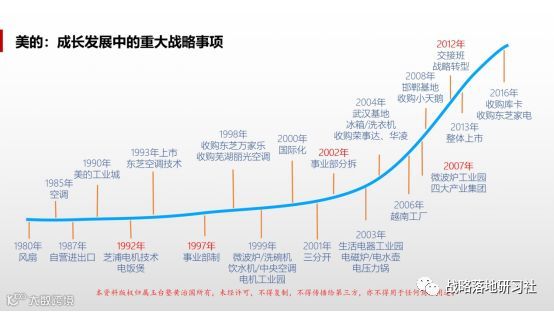 这是美的发展过程中一些基本脉络、主要事件。我想强调的是,在这过程当中,我们看到美的每过个五年左右,就会出现一个比较大的变化和调整。我回过头来总结,体会就更深,就是美的实际上是一个非常敢于自我否定、敢于自我变革的企业。这样的话,就让整个这个组织保持着一种活力。所以美的的自我迭代能力很强,包括何老板、包括美的的高管团队都是如此,这是驱动企业不断向前的一个很重要的因素。