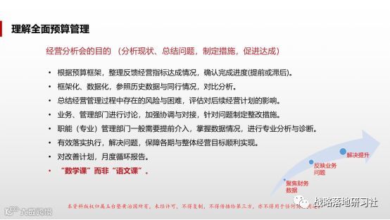 当然,绝对不是预算一出来,就可以了,另外还要通过经营分析(主要是经营分析会)来不断检查分析。预算一定是拆到每个月的,每个月再开经营分析会。针对的来看,当时的预算是不是得到了有效的执行,偏差在哪里?为什么有偏差?为什么有的完成了、有的没完成?问题出在哪里?是什么原因?这个是一定要搞清楚的,然后就针对性一项项来改善,管理就是这样进步的,经营能力就是这样一点点积累起来的。