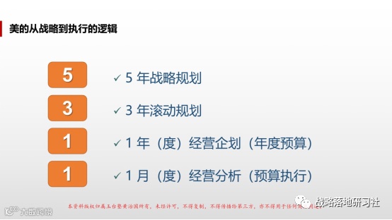 我们对美的经营实践总结,认为美的的整个从战略到执行就是这五个环节。我认为一般一个企业要真正由战略到执行,也是这五个环节,缺一不可。
