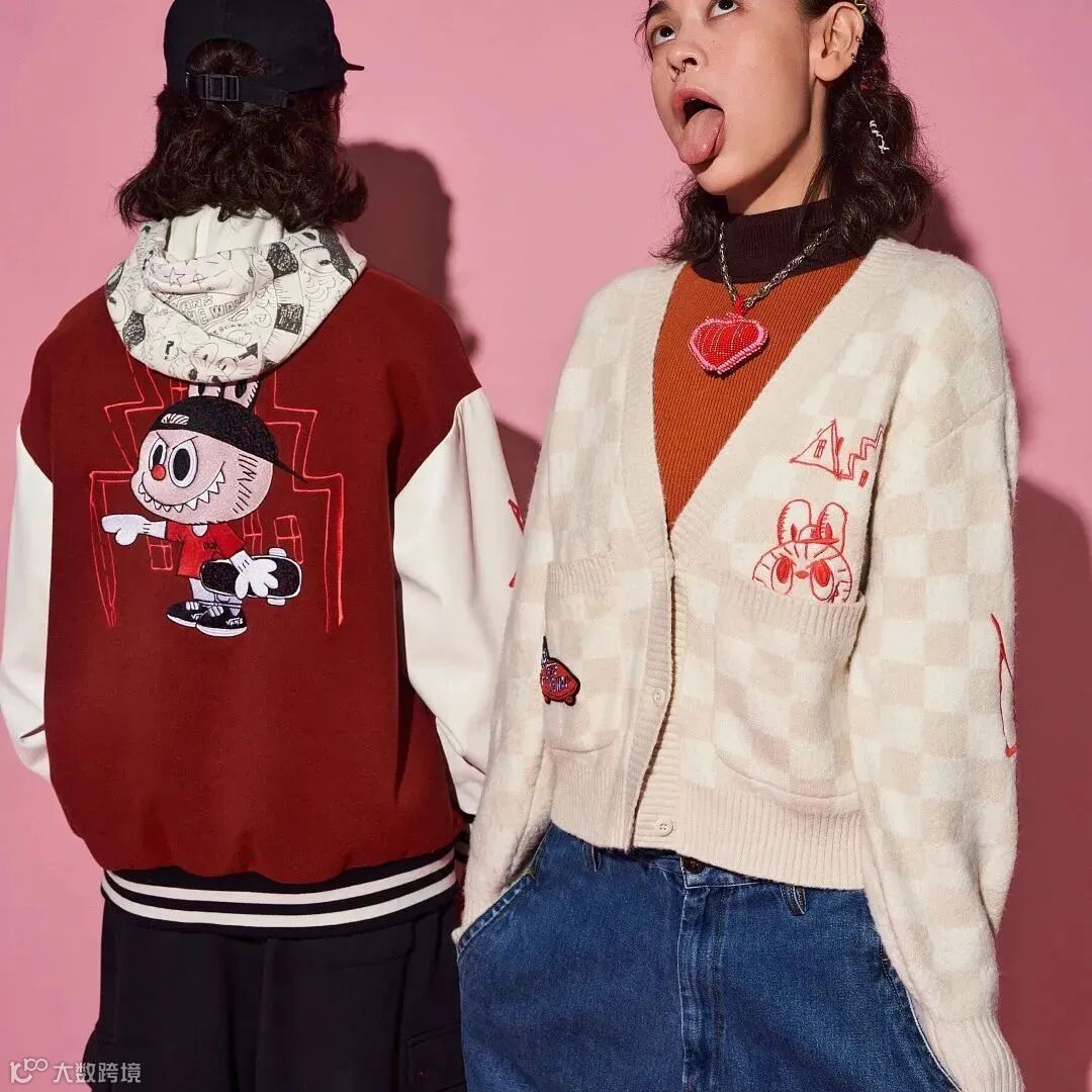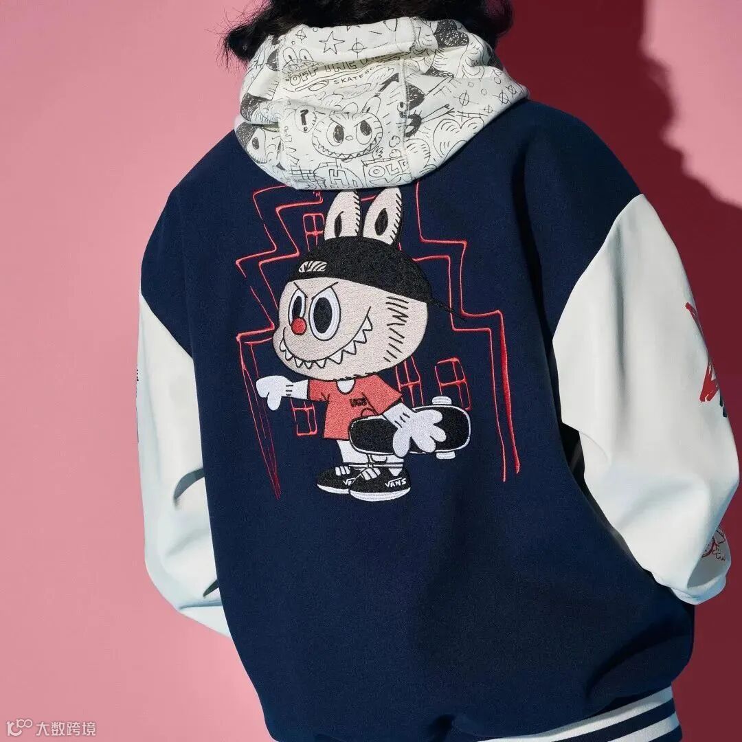 棒球夹克由米白色和酒红色组成,开衫毛衣则选用了 Vans 代表性的棋盘格元素以米白色呈现,并在两款服饰上的不同细节处以刺绣或印花的形式体现“LABUBU”滑板形象;卫衣在灰色的纯色设计上,以暗纹的形式铺满“LABUBU”形象。