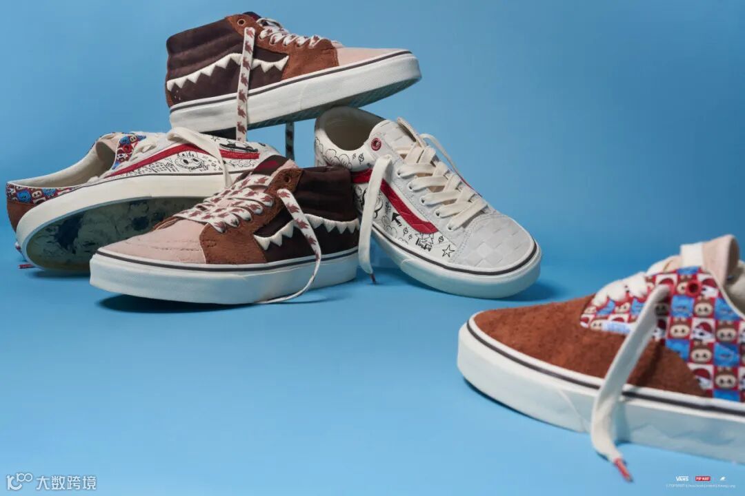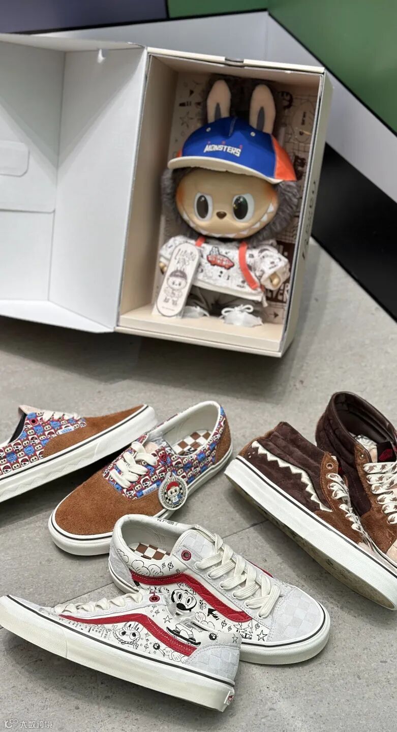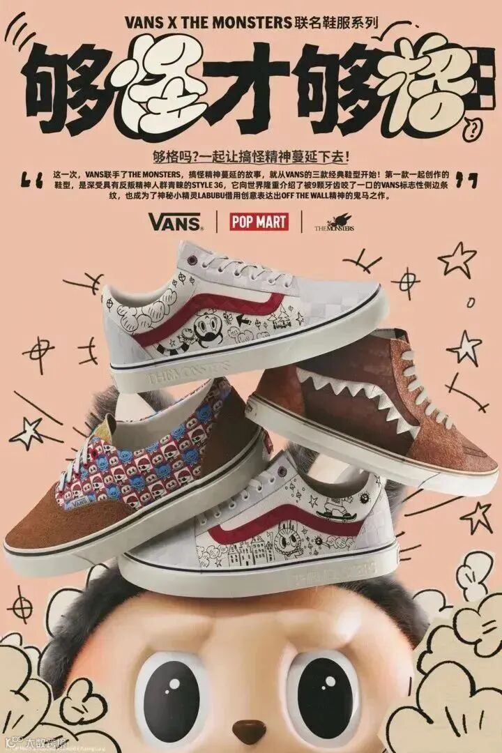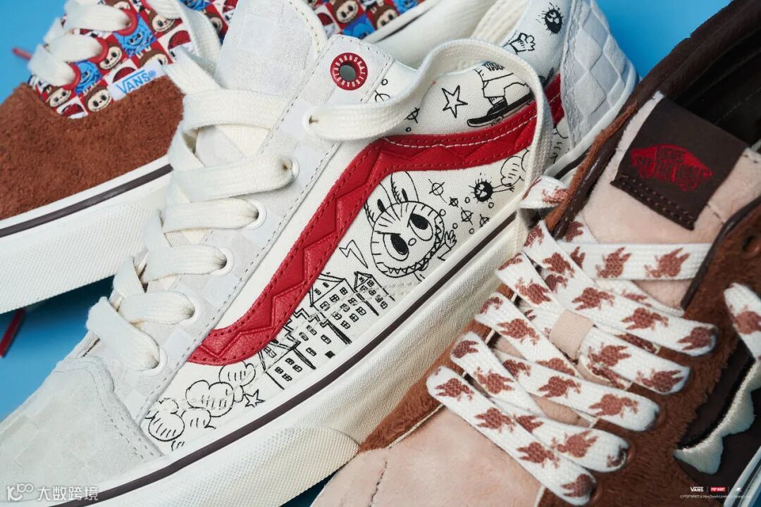 此次联名设计鞋款选用三双 Vans 经典鞋款 Style 36、Era 和 Sk8-Mid ,结合 Vans品牌文化及经典元素与“LABUBU”形象进行设计。“LABUBU”锯齿状的牙齿作为 IP 形象主要特色被放大运用至 Style 36 和 Sk8-mid 鞋款设计中。