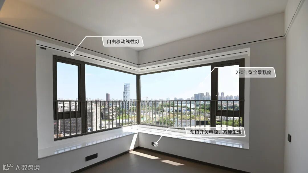 空间不设限,将居住者的喜好,融入空间之中自由碰撞,在主卧空间的设计上,在270°L型景观飘窗预留开关插座,充分考量空间主人的需求,在日常打开多重生活,享受到自然江景的美好和生活的便捷。