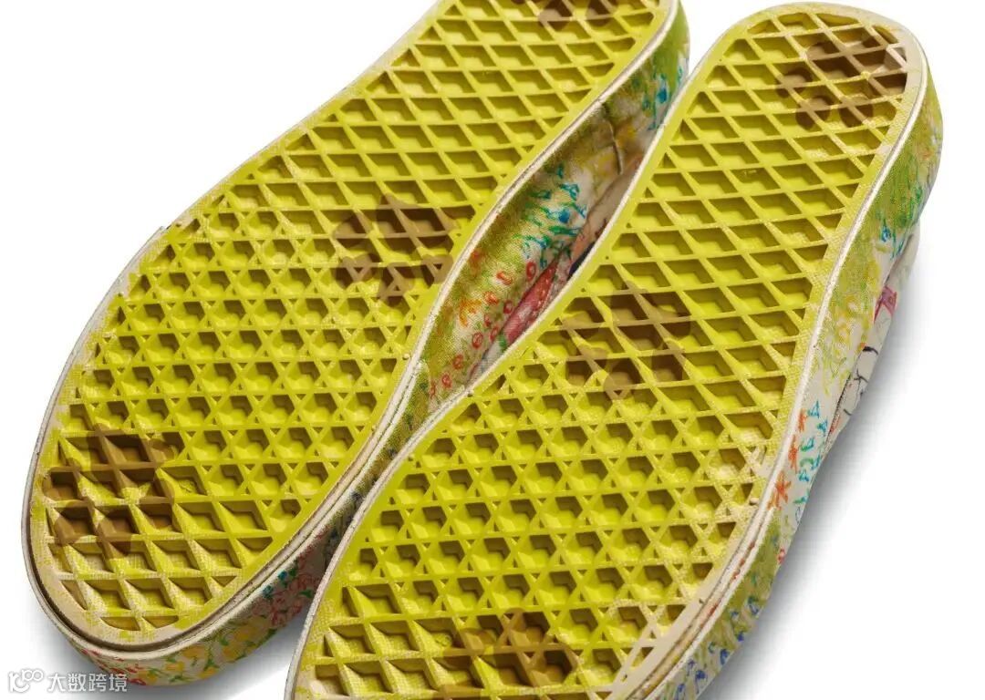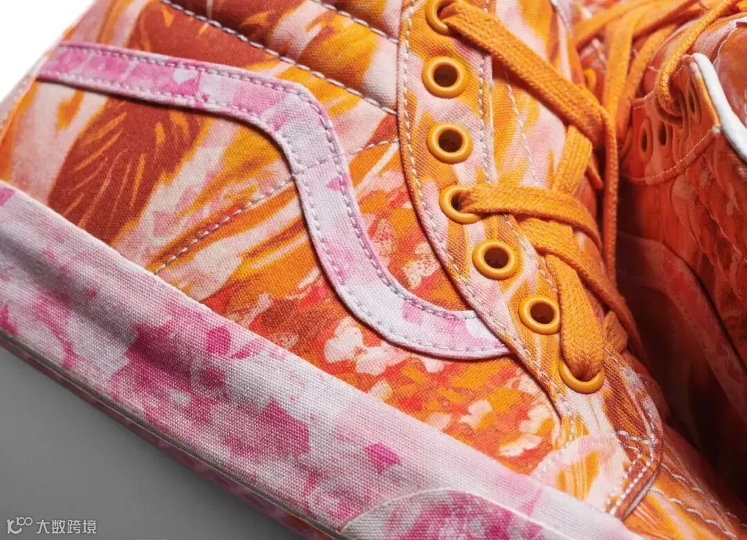 Vans x Collina Strada 联名鞋服系列涵盖三双鞋款。其中,Sk8-Hi 38 DX 鞋面包裹抽象化的蝴蝶印花,大底包边铺满天使与花卉结合而成的丝网印刷图案,搭配饰以 Collina Strada 品牌标签的后帮;值得一提的是,Hillary Taymour 邀请合作方和参观者在 Collina Strada 工作室绘制他们的梦想家园,并将此手工绘图生成 Classic Slip-On 98 DX 鞋款的主印花设计,鲜花图案覆盖于大底包边,田园牧歌般的邻里场景描绘于帆布鞋面。