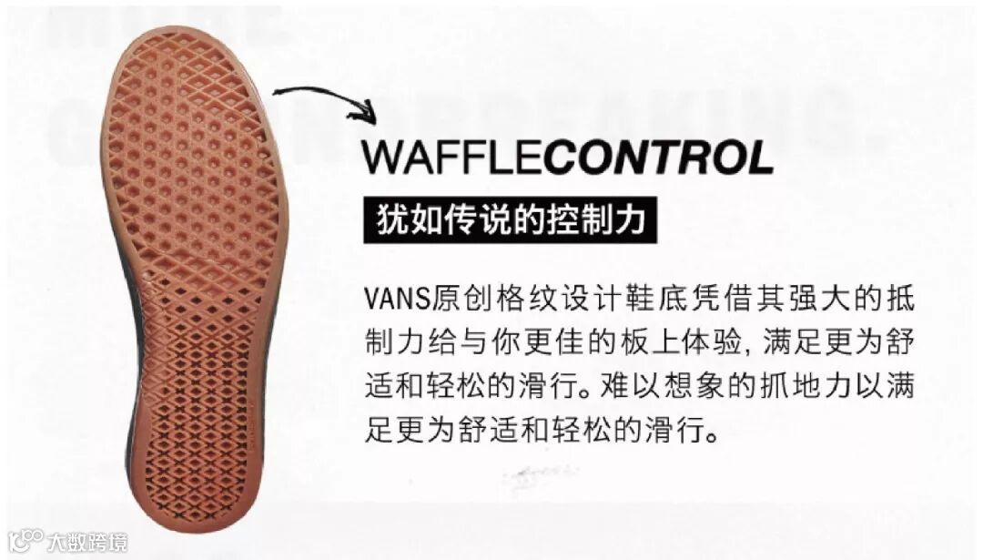 通过简化鞋子独立部件的数量,使脚部和滑板得以更加贴合,Vans 突破性的 WaffleControl™ 科技带来了更加出色的控板性能,更加及时的响应速率以及内置缓冲,将进一步助推滑板运动的极限。