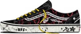 Style 36鞋款其灵感来自男孩们在霍金斯高中加入的龙与地下城俱乐部的 Vans Old Skool 「Hellfire Club」。该鞋款采用黑色帆布鞋面,带有红色裂纹印花,向剧中的地狱深处致敬;其他细节包括爵士条纹上的链节,外侧的恶魔和燃烧的剑,以及中底上带有「Hell Can Wait」的斧头,整体带有复古做旧质感。此外合作鞋款带有联合品牌的吊牌、鞋垫和包装。