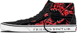 SK8 Hi 鞋款采用翻毛皮覆面搭配高密度藤蔓印花,侧面鞋身印有 “Friends Don’t Lie” 标语,藤蔓鞋垫印花及带水晶外底的Demogorkon牙齿印花为设计亮点。