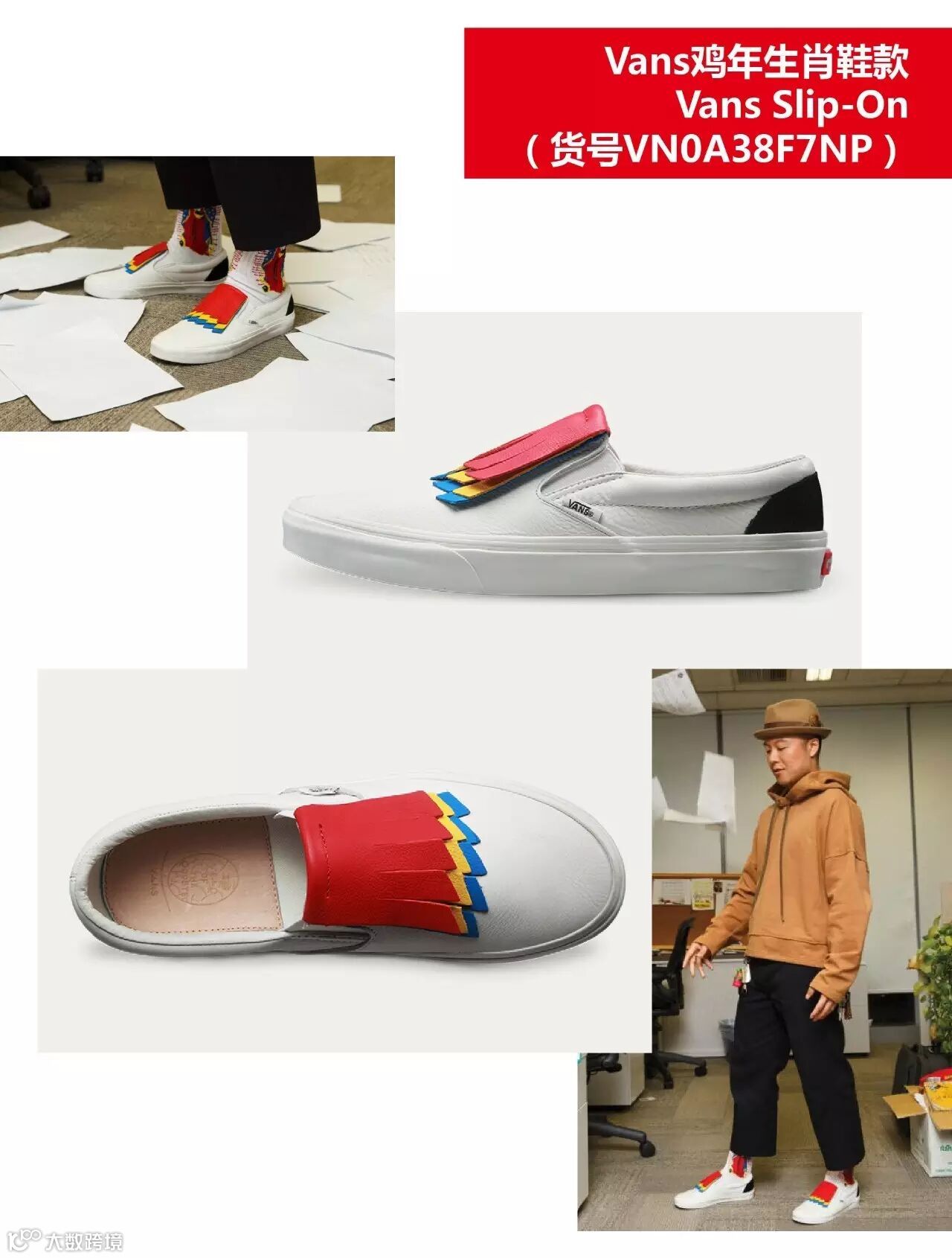 Vans鸡年生肖鞋款Vans Slip-On,白色皮质鞋身,点缀三色层叠饰片,鲜活地模拟出艳丽的公鸡尾巴,红白相间也很适合圣诞色调哦。
