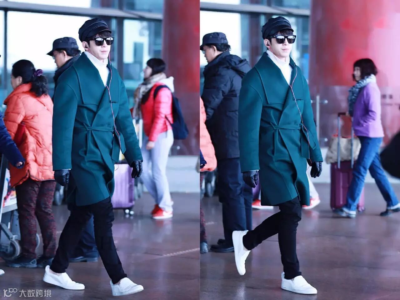 小井童鞋轻松驾驭绿色:墨绿大衣+黑色裤子,内搭的白色毛衣和白色帆布鞋相呼应,红色耳机点缀,超有圣诞Feel,既潮又型!