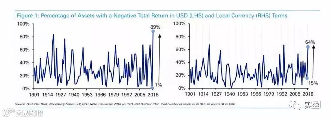 来自另一家大行德意志银行的报告也展示了类似情况,截至10月底,在德意志银行长年追踪的全球金融资产当中,高达89%的资产在美元计价下年初至今的投资回报率都是负数。这是德意志银行从1901年有相关记录以来的最高记录,超过了1920年创下的84%历史峰值。即便以本币计价,上述指标也高达64%。