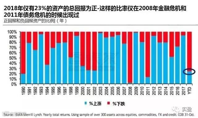 美银美林近日发布了一份报告,该行统计了横跨股票、大宗商品、外汇和债券等类别的300多个资产,发现全球仅有23%的资产实现了年度的正回报(截至10月31日),该行还指出如此低的水平往往仅出现在金融和债务危机发生时。