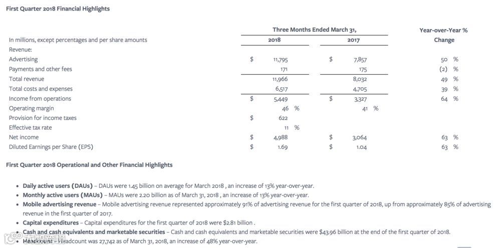 Facebook于当地时间4月25日发布了2018财年第一季度,截至3月31日的未经审计的财报。