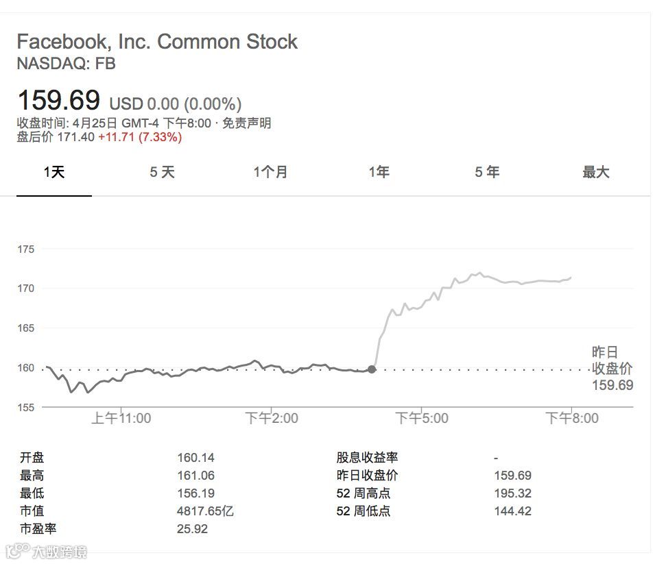 盘后公布财报后,Facebook股价涨幅扩大,盘后涨超7%。