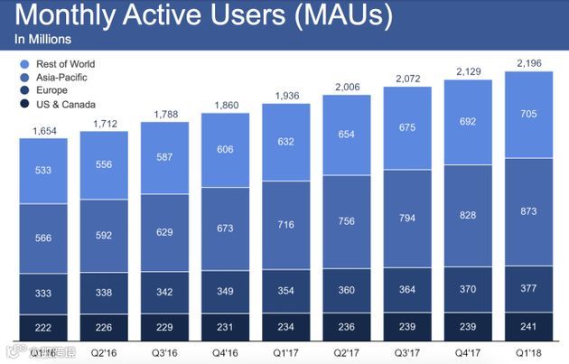 截至2018年3月31日,Facebook月度活跃用户人数(MAU)为22.0亿人,比去年同期增长13%。去年第四季度的平均月度活跃用户人数为21.3亿人。