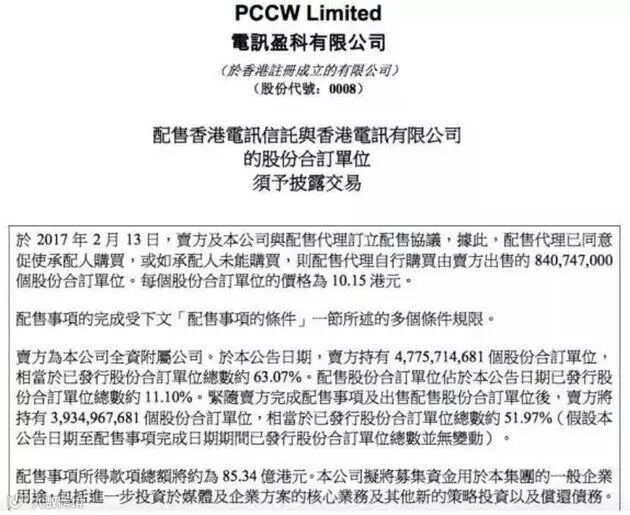 今日(2月13日),电讯盈科公告称,公司通过配售方式向卖方配售约8.4亿股,交易价格为10.15港元,通过此次交易,电讯盈科将出售香港电讯信托及香港电讯的股份,其持股比例也将从63.07%减少至51.97%,而套现金额也将达到85.34亿港元。
