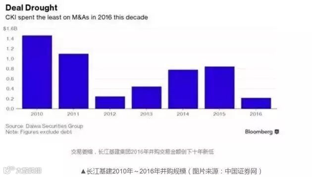 根据大和证券(Daiwa Securities Group)估计,李嘉诚旗下的长江基建集团2016年完成的并购交易规模量创下10年来新低,该集团是为长江和记实业贡献最多利润的公司。李嘉诚指望通过收购澳大利亚的Duet Group 摆脱他的并购困境,同时也有助于李嘉诚在欧洲尤其是英国以外的地区进行多元化扩张。