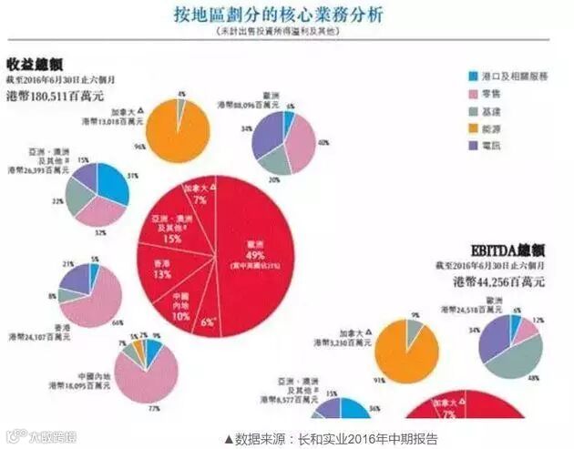 这一点从公司的财报中就得到来体现。长和2016年中期报告显示,长和的收入最大的来源地是欧洲,达到了49%;第二大的收入来源地为亚太地区(中国香港及中国内地除外),达到了15%;中国香港仅贡献13%的收入;而中国内地贡献收入也只有10%。
