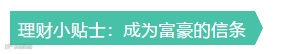 第四,很早就开始有了理财意识。如果你还没有开始注意、计划并管理自己的财务,那么,从现在开始还为时不晚。不过,光有意识还是不够,重要的是必须执行。正如亚洲首富豪李嘉诚所主张的:20岁以前,所有的钱都是靠双手勤劳换来,20~30岁之间是努力赚钱和存钱的时候,30岁以后,投资理财的重要性逐渐提高。所以,李嘉诚有一句名言:“30岁以前人要靠体力、智力赚钱,30岁之后要靠钱赚钱。