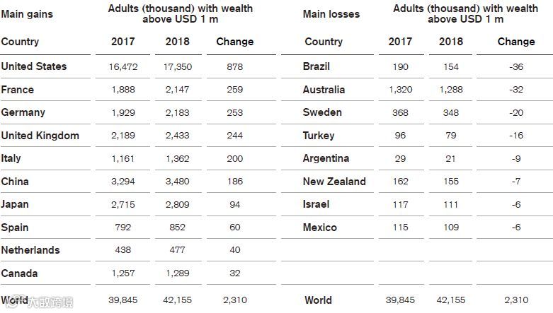 与此同时,土耳其(下降16,000人)、瑞典(下降20,000人)、澳大利亚(下降32,000人)和巴西(下降36,000人)是百万富翁减少最多的国家。
