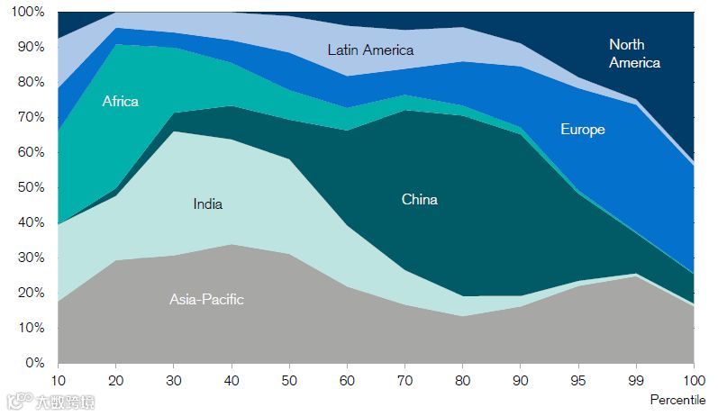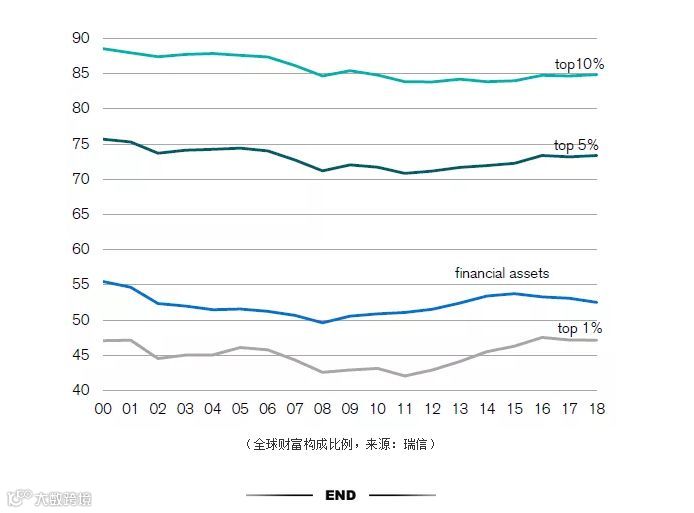 截至2018年年中,全球最富有的10%拥有全球84.8%的财富,最富有的5%拥有全球73.4%的财富。瑞信特别指出,全球最富有1%人群的资产占全球财富的份额与金融资产占全球财富的份额高度相关。