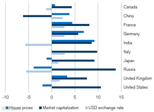 瑞信指出,在全球财富的统计中,股市、楼市和汇率是对于地区财富影响最大的要素。