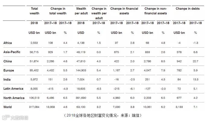 截至2018年年中,全球财富总额达到了317万亿美元,较上一年增长4.6%。虽然增长率不及2017年同期,但依旧高于2008年次贷危机后的平均水准。