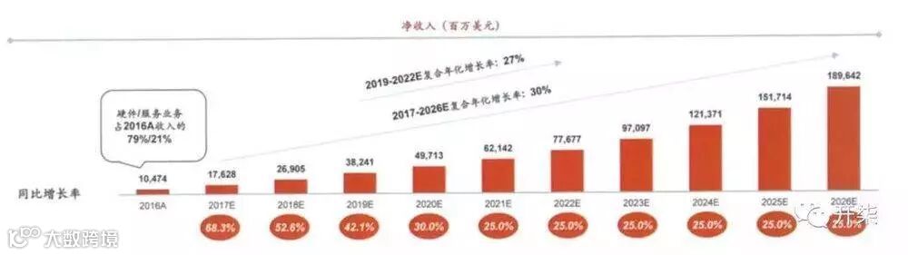2016 年,小米的收入组成中,79% 来自于硬件,21% 来自于互联网服务业务。硬件业务的净利润率仅为 2.8%,而互联网服务业务的净利润率则超过 40%。小米正在扩大互联网服务业务收入比例,2017 年,预计互联网服务业务的收入占比为 68.3%,预计到 2019 年,互联网服务业务的收入占比将超过硬件收入。