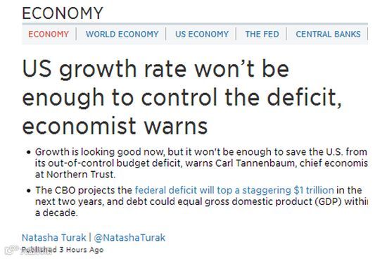 美国北方信托的首席经济学家卡尔-坦南鲍姆(Carl Tannenbaum)在给客户的周报中表示,尽管美国经济增长状况看似良好,但还不足以将美国从已经失控了的预算赤字中拯救出来。