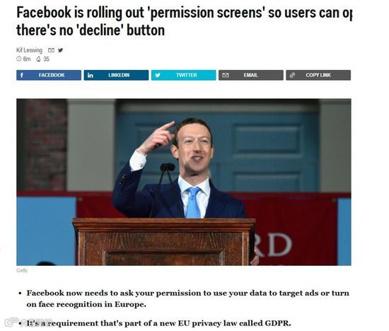 Facebook现在需要获得您的许可,才能使用您的数据在欧洲投放广告或启用人脸识别。这是欧盟新隐私法GDPR的一部分。但据路透社( Reuters )报道,即便是Facebook的新隐私屏幕也没有明确给用户“拒绝”的选择。他们将引导用户“接受并继续”或“管理数据设置。