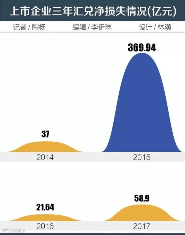 21世纪经济报道记者查阅wind数据发现,2014年上市公司汇兑损失仅37亿元,而2015年汇兑净损失达369.94亿元,2016年则减少至21.64亿元;而根据2017年半年报披露情况来看,上半年上市公司汇兑净损失达58.9亿元,相较于去年同期翻了一倍多。