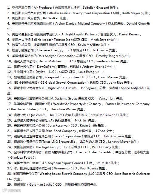这些企业家大佬包括大家耳熟能详的高盛集团CEO劳尔德·贝兰克梵、波音民用飞机集团总裁兼CEO凯文·迈卡利斯特、通用电气公司副董事长庄睿思等人。此外,还有陶氏杜邦公司董事长利伟诚(Andrew Liveris)、霍尼韦尔公司高增长区总裁沈达理(Shane Tedjarati)、波音商用飞机部门总裁Kevin McAllister等都参与随行。