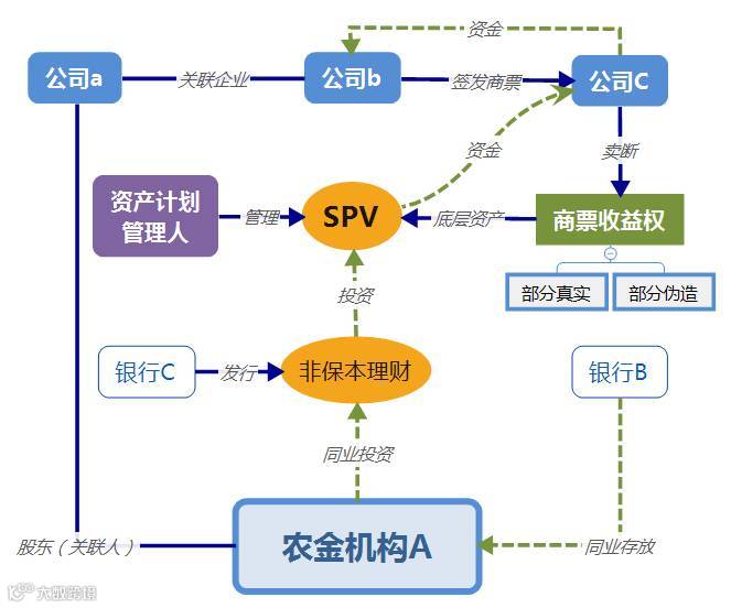 二、严格规范票据业务。督促辖内机构审慎开展商业承兑汇票相关业务,高度关注以商业承兑汇票为基础资产的特定目的载体投资业务风险。近期也暴露出此类投资业务风险的案例,法询金融根据案例描述绘图如下:
