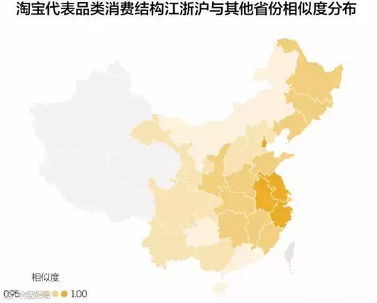 既然消费结构是一个地区消费成熟度的反映,那么我们就以“包邮区”消费结构为标杆,比较下其他省份与包邮区消费结构相似度,可以看到呈现出的还是东高西低的状态——类似中国地区GDP分布。