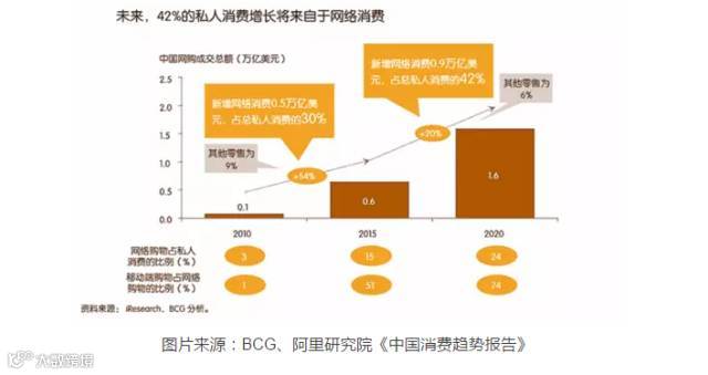增长,达到近1.6万亿美元,并占私人消费总额的24%。届时,每增长1元的私人消费中,就有0.42元是由网购购物带来的。