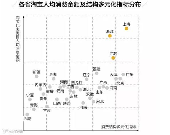 它们虽然网购消费还不是很成熟——表现为消费商品品类相对局限,但是人均网购金额也不低,最典型的是新疆和四川。