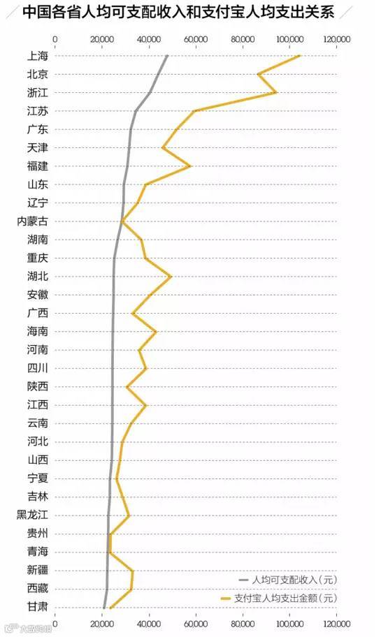 如图,随着人均可支配收入增加,支付宝人均支出金额越来越大,而且人均可支配收入提升到了一定“境界”之后,支付宝开销的力度提升会明显“倍增”——这在东部沿海省份上表现得最为显著。