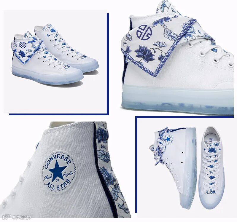 此次合作鞋款从代表中国文化符号之一的“青花瓷”中汲取设计灵感,用充满力量感的设计语言演绎高帮Chuck70,打破东西文化之间的壁垒——以青花瓷、莲花图案,结合Bandana,配以黑暗中发光的青花瓷图案夜光大底,以中西合璧之力创造出这双雕琢细节的Chuck70
