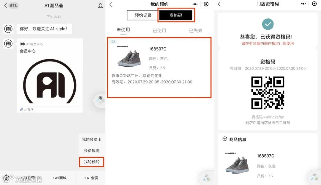 进入“A1潮品荟”微信公众号,在菜单栏中【A1会员】——【我的预约】——【资格码】查看中签资格码