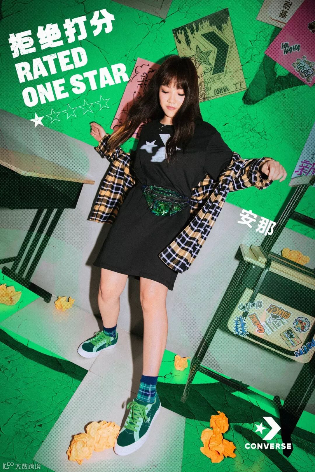 △脚踩一双绿色撞色One Star的安那真的可以说是又嘻哈又少女,绿色格纹袜子和绿色小腰包,更添一丝鬼马~