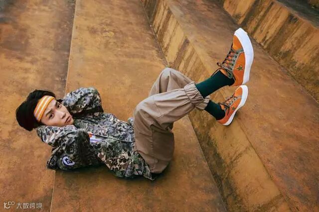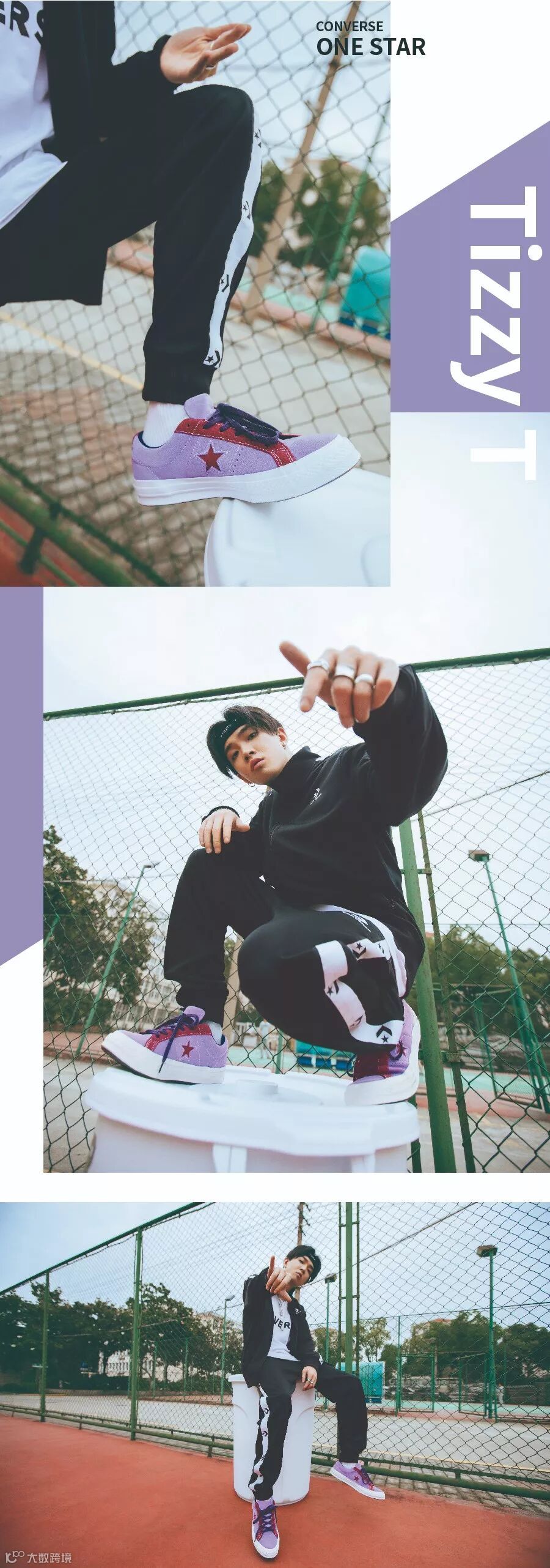△上衣和裤子一身黑白撞色,黑色运动头带呼应,以一双紫色撞色的One Star作为全身的亮点,不得不说Tizzy T嘻哈范真的很地道~
