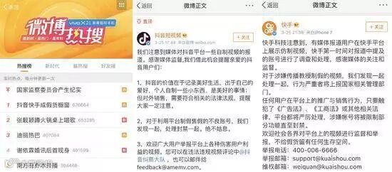 针对南都调查报道,抖音与快手于25日陆续发微博回应,两平台均表示,感谢媒体监督,将对不良账号进行调查处理,并公布了举报方式。