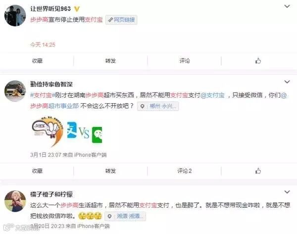 @IT之家【沃尔玛之后,曝步步高超市禁用支付宝】3月24日,在沃尔玛被曝光禁用支付宝后,有网友在网上爆料称,另外一家腾讯阵营零售企业:步步高商超门店也禁用支付宝,只接受微信支付。资料显示,步步高门店主要集中在湖南、贵州、四川、重庆、云南等大西南地区,目前已有592家。