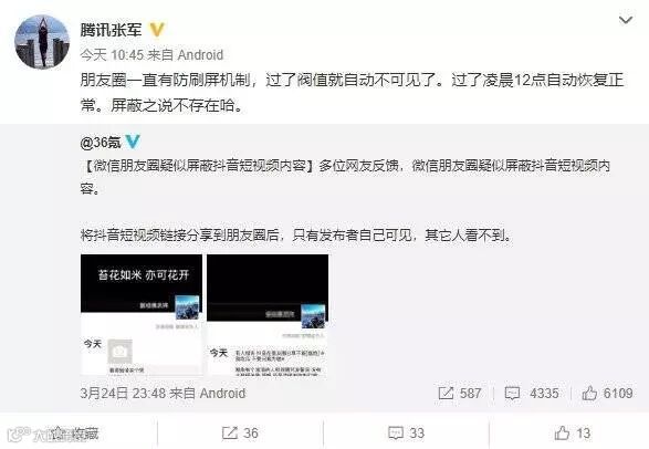 朋友圈屏蔽抖音?腾讯回应:系统BUG