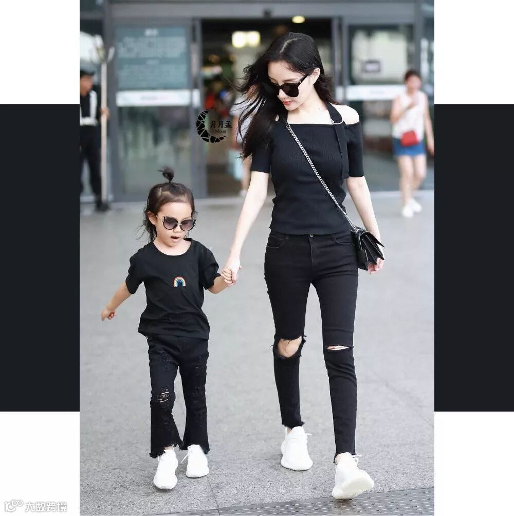 李小璐和超人气小甜馨的这一组亲子装,母女黑衣黑裤搭配小白鞋,还有裤子的破洞加持,日常又带感,这组同步小A给两百分~