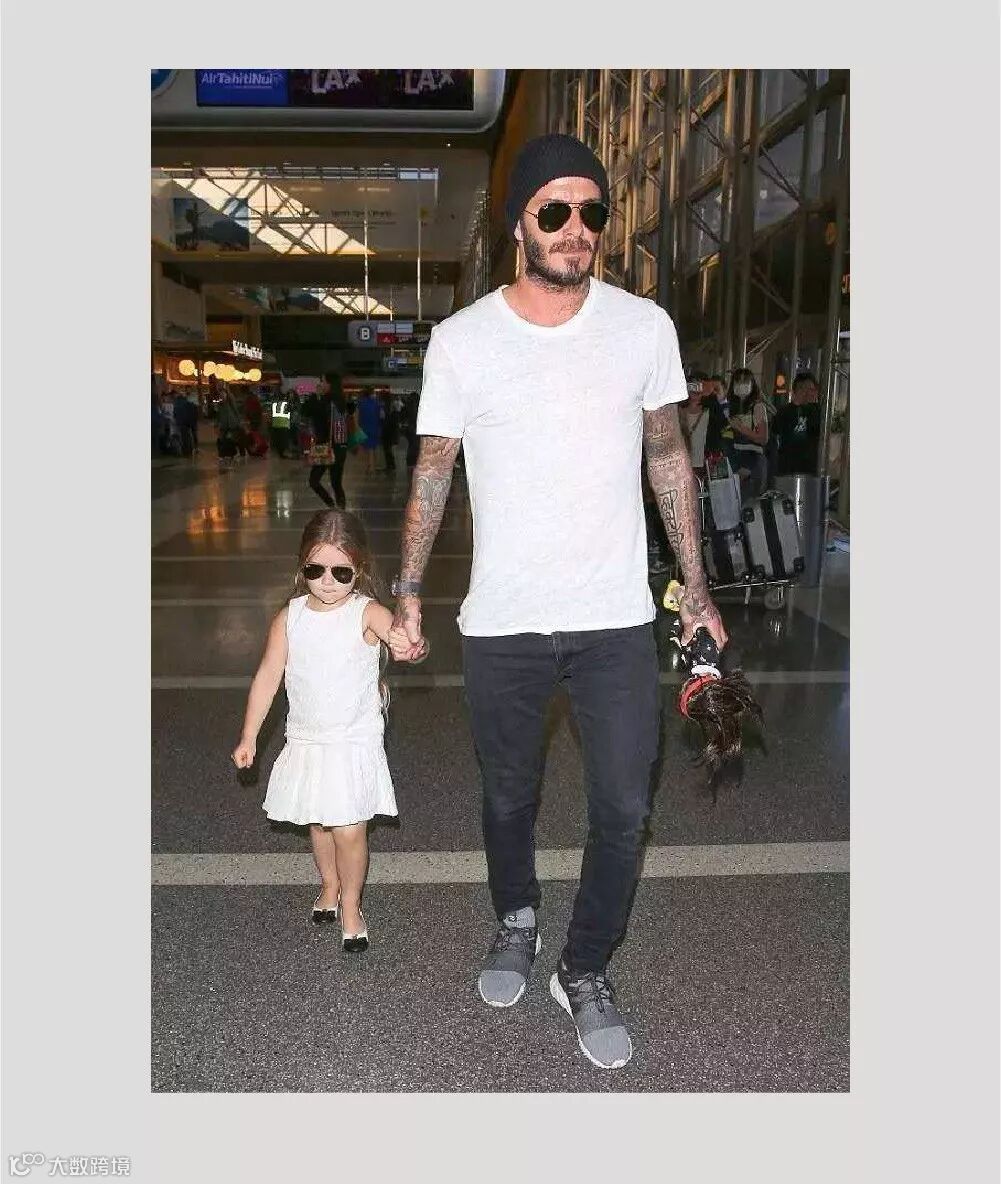 贝克汉姆和女儿小七在机场亮相,粑粑穿白色基础款T恤,小七的一身素白,同款墨镜起到了画龙点睛的妙用,形成很好的呼应。这样的亲子装,秀得自然又到位。