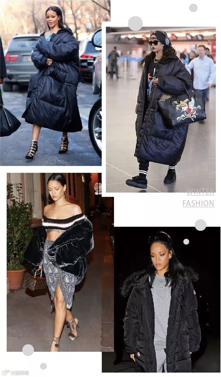 △ 最敢穿的音乐圈天后蕾哈娜,亲身示范了用羽绒服穿出的时尚感