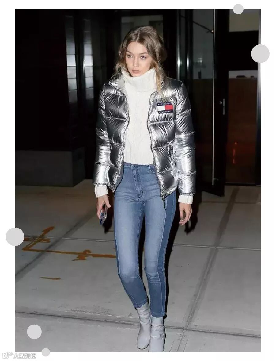 △ 超模Gigi Hadid穿的银色亮面羽绒服,极具未来感