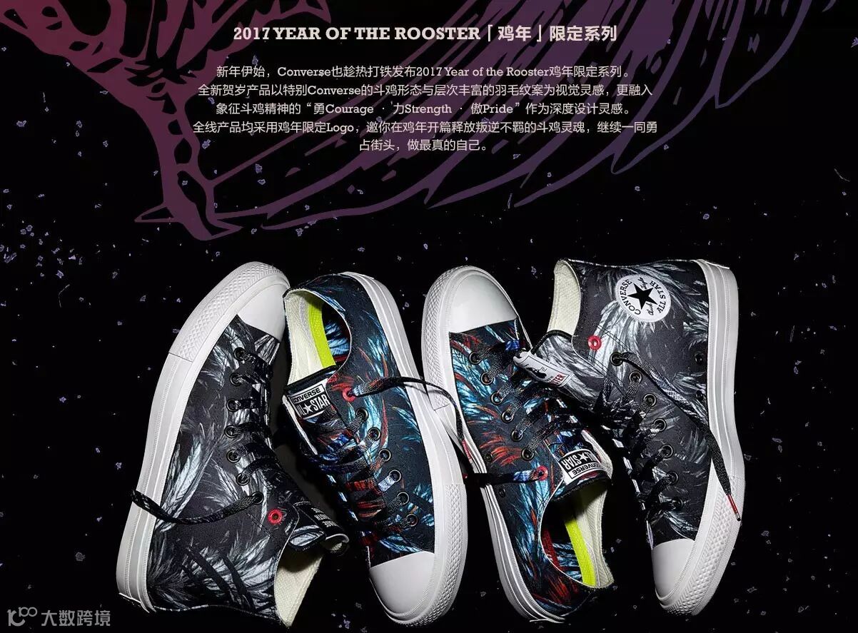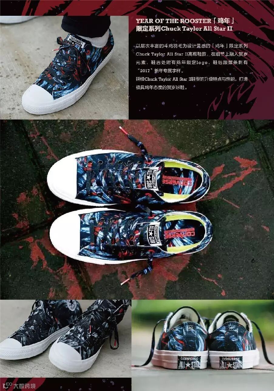 YEAR OF THE ROOSTER鸡年限定系列Chuck Taylor All StarⅡ鞋款,在细节上融入贺岁元素,鞋舌处附有鸡年限定logo,鞋后跟刺有“2017”新年专属字样,打造极具鸡年态度的贺岁球鞋。