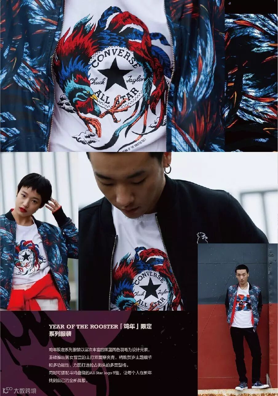 YEAR OF THE ROOSTER鸡年限定系列服装,以层次丰富的黑蓝两色羽毛为设计元素,重磅推出男女皆宜的双面夹克,搭配斗鸡盘绕ALL STAR logo的T恤,街头多面型格风范。